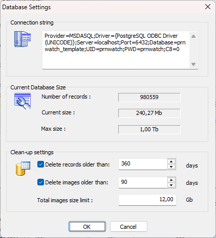 - Total images size limit — Maximum size of stored images in the database. If the specified size is exceeded, the oldest images of printed documents will be deleted.