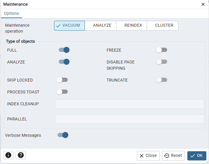 Example of using VACUUM FULL in pgAdmin: